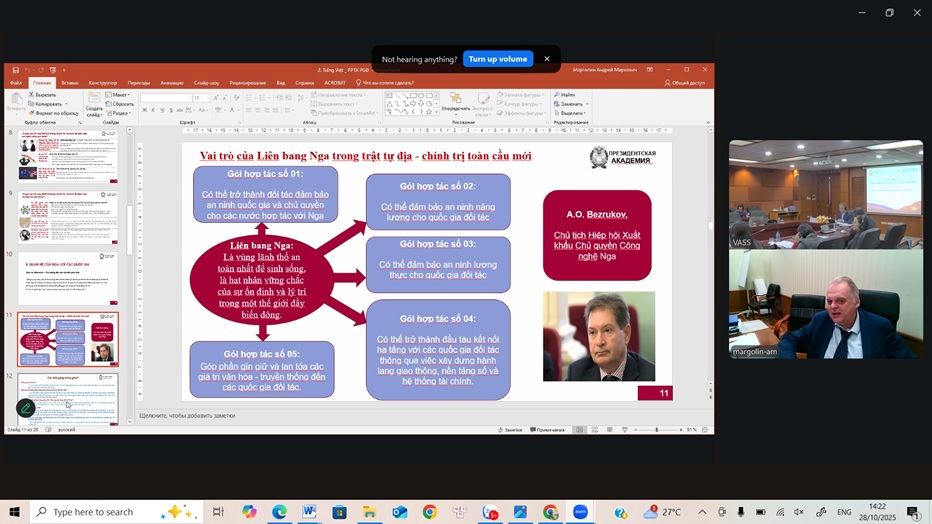 Hội thảo được tổ chức sáng ngày 28/10/2025, tại Trụ sở Viện Hàn lâm theo hình thức trực tiếp kết hợp trực tuyến với sự tham dự của TS. Đặng Xuân Thanh, Phó Chủ tịch Viện Hàn lâm; GS. Andrey Margolin, Phó Giám đốc RANEPA tham dự và trình bày báo cáo trực tuyến; cùng đông đảo đại biểu, các nhà khoa học của VASS và RANEPA.