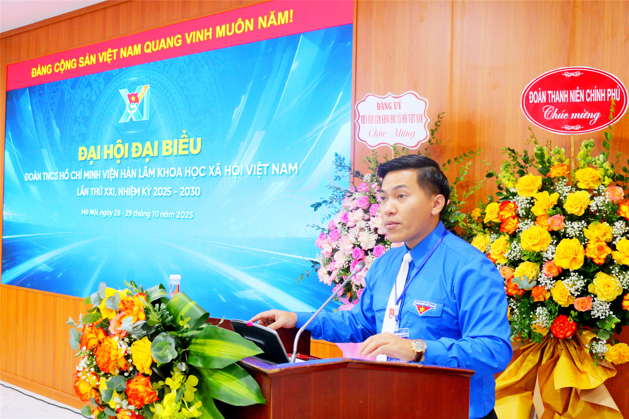 Đồng chí Trần Đình Hưng, Phó Bí thư Đoàn Viện Hàn lâm trình bày Báo cáo kiểm điểm của Ban Chấp hành Đoàn Thanh niên Viện Hàn lâm KHXH Việt Nam giai đoạn 2022-2025