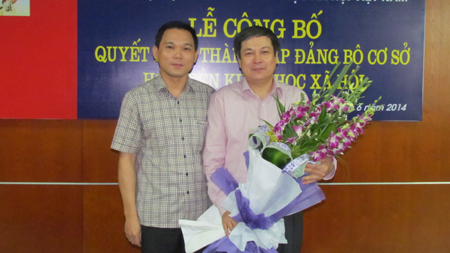 ThS. Vũ Mạnh Dũng, Phó Chủ tịch Công đoàn Học viện KHXH tặng hoa chúc mừng Đảng bộ cơ sở Học viện KHXH trong buổi Lễ