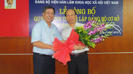 GS.TS. Võ Khánh Vinh, Phó Bí thư Đảng ủy Viện Hàn lâm, Phó Chủ tịch Viện Hàn lâm tặng hoa chúc mừng Đảng bộ cơ sở Học viện KHXH nhân Lễ công bố Quyết định thành lập