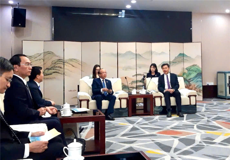 Chủ tịch Phan Chí Hiếu trao đổi với đồng chí Hứa Vĩnh Quả, Phó Chủ tịch Thường trực Chính quyền Nhân dân Khu tự trị dân tộc Choang Quảng Tây